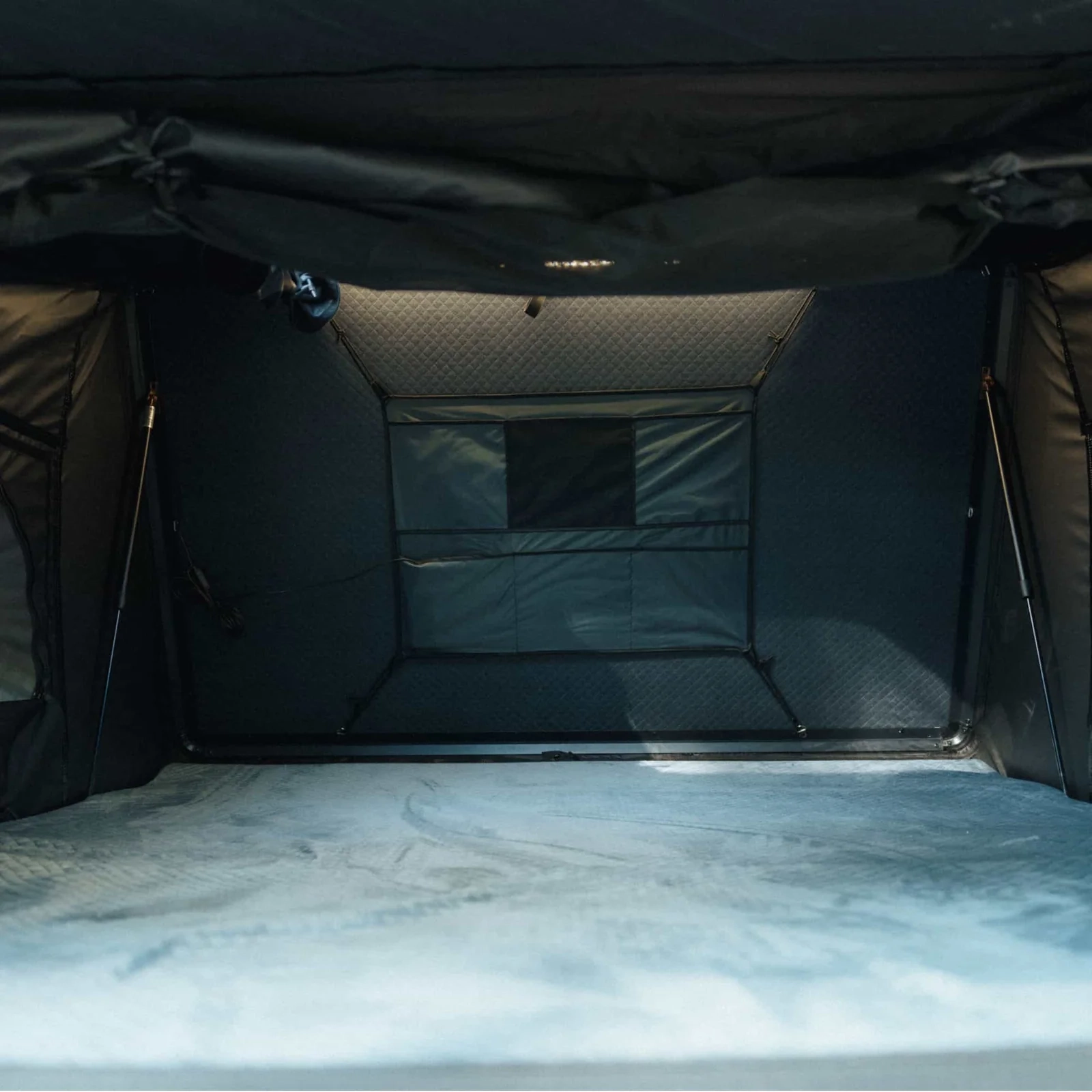 Un intérieur pensé pour 3 à 4 personnes : L’un des atouts majeurs de l’Expedition L est son espace de couchage généreux. Avec son matelas King Size de 200 × 180 cm, cette tente est idéale pour accueillir une famille, un trio d’amis ou même un couple qui aime l’espace. Les dimensions intérieures, avec une hauteur d’environ 120 cm, permettent de se déplacer facilement à l’intérieur, ce qui est rare sur des tentes rigides de toit.