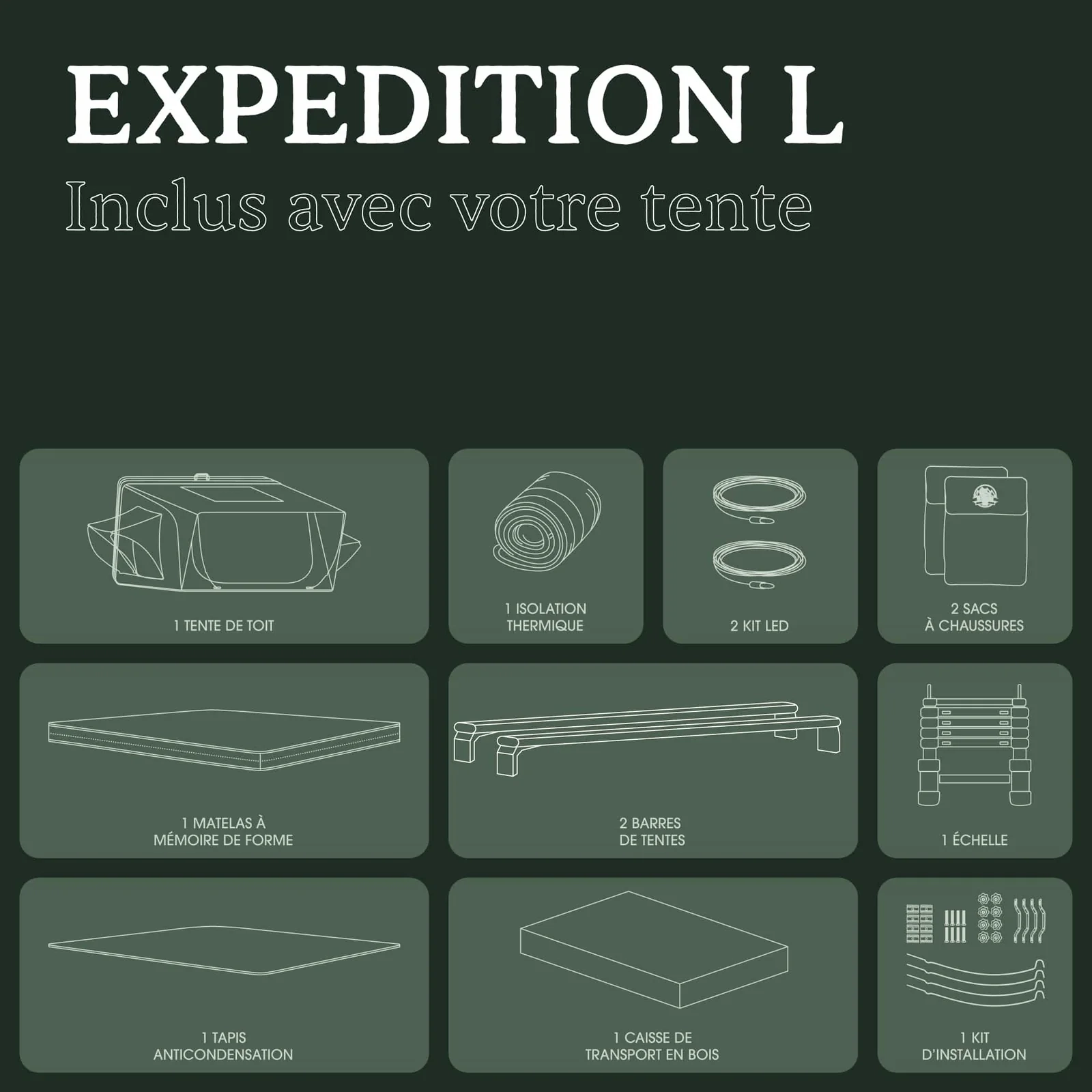 L’Expedition L est livrée complète avec isolation thermique, tapis anti-condensation, échelle télescopique, barres de tente, kits LED, rangements intérieurs et caisse de transport en bois — tout ce qu’il faut pour installer ton campement en quelques minutes et profiter de l’aventure sans perdre de temps.