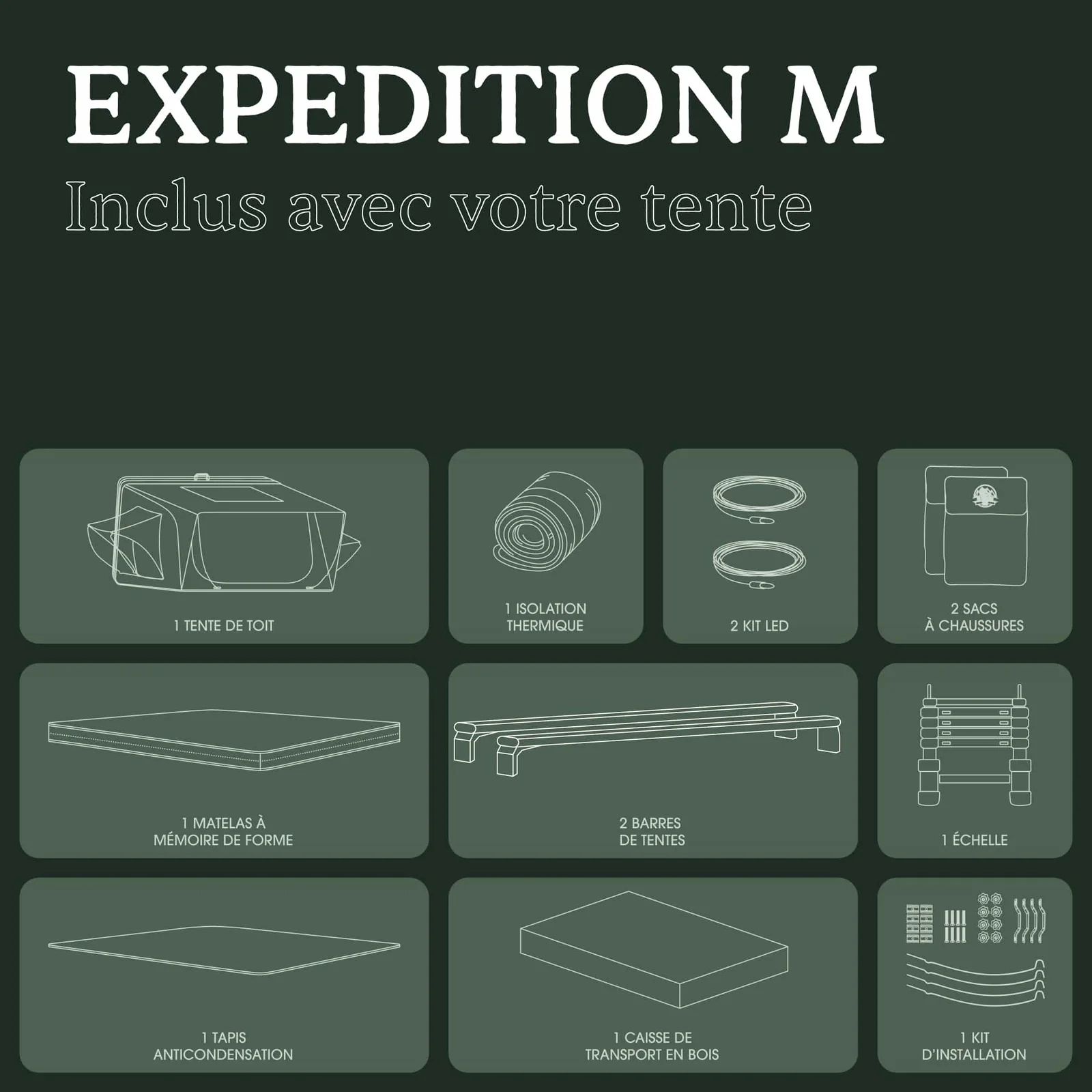 Installation simple et équipement complet : L’un des grands avantages de l’Expedition M est qu’elle est livrée complète, avec tous les accessoires nécessaires inclus : échelle télescopique, matelas à mémoire de forme, tapis anti-condensation, kit LED, auvent, rangements intérieurs, barres de tente et caisse de transport en contreplaqué.