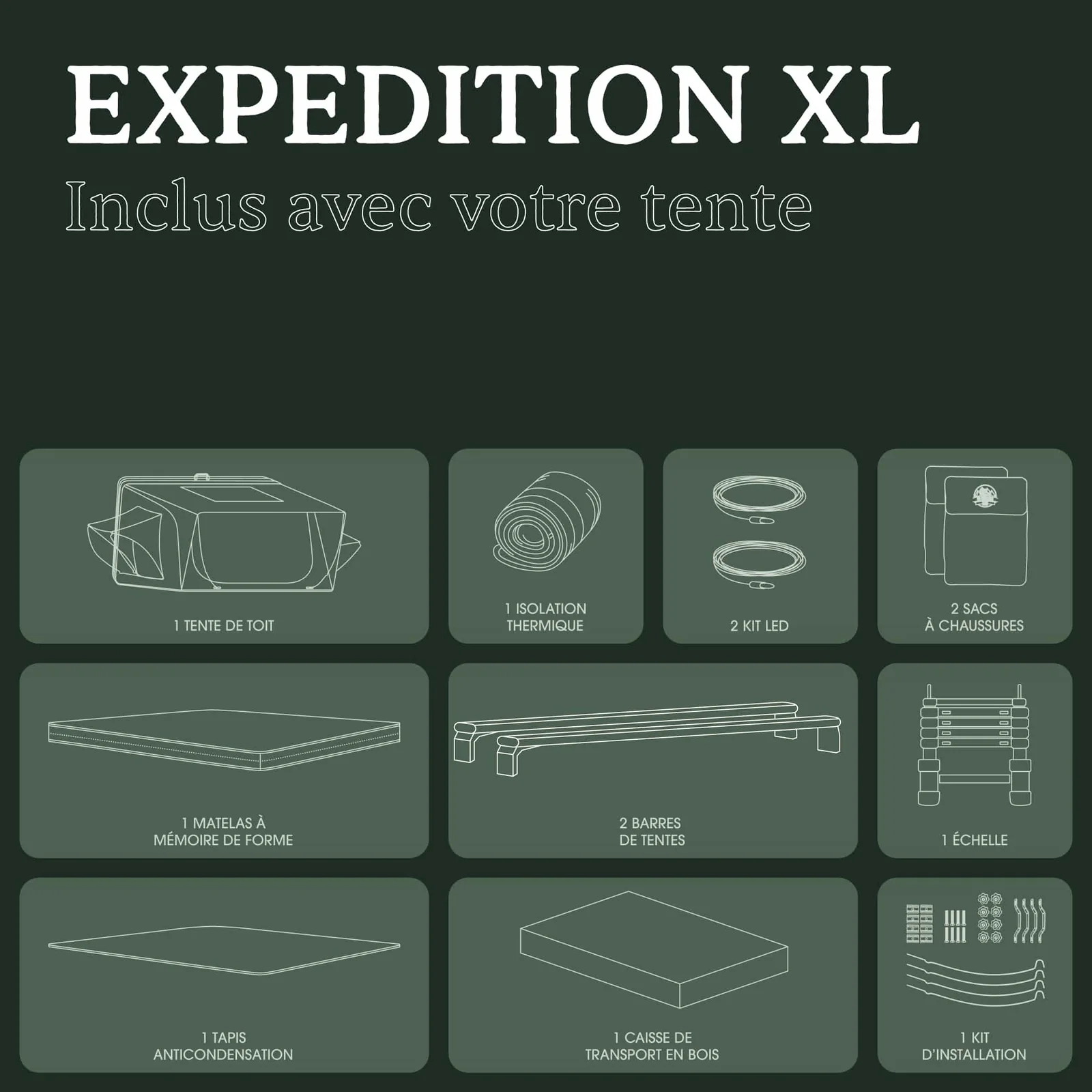Livrée complète avec tous les accessoires essentiels — matelas à mémoire de forme, échelle télescopique, isolation, tapis anti-condensation, kits LED, barres de tente, rangements internes et caisse de transport — tu pourras installer rapidement ton campement et profiter de la nature sans souci.
