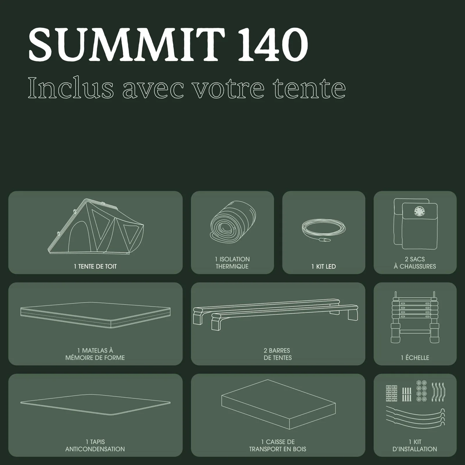Livrée complète avec accessoires essentiels (échelle télescopique, isolation, tapis anti-condensation, kit LED, poches de rangement, barres de tente et caisse de transport), la Summit 140 est prête à vous suivre dans toutes vos aventures, que ce soit pour un week-end escapade ou un roadtrip prolongé.