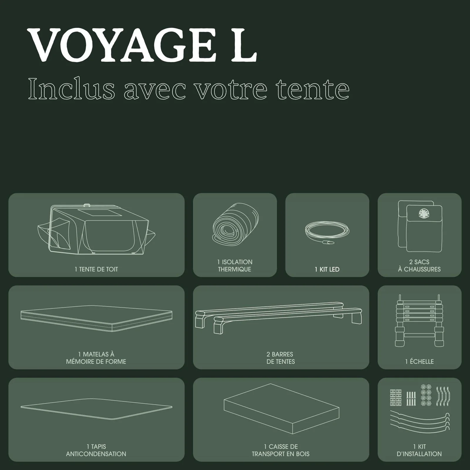 Installation rapide et équipement complet : Go Overland place l’expérience utilisateur au cœur de sa conception : la Voyage L s’installe rapidement et intuitivement grâce à un système d’ouverture assistée, même si tu es seul à le faire. Elle est livrée complète avec tous les accessoires essentiels : isolation thermique, tapis anti-condensation, matelas mémoire de forme, échelle télescopique, kit LED intégré, nombreux rangements intérieurs, barres de tente et une caisse de transport en contreplaqué.
